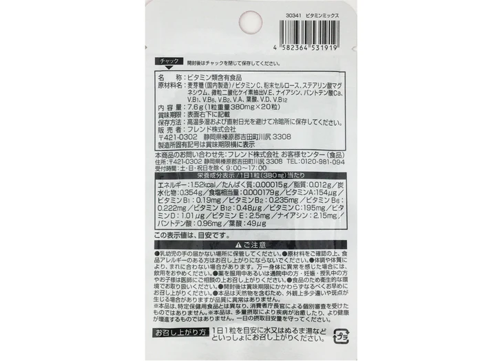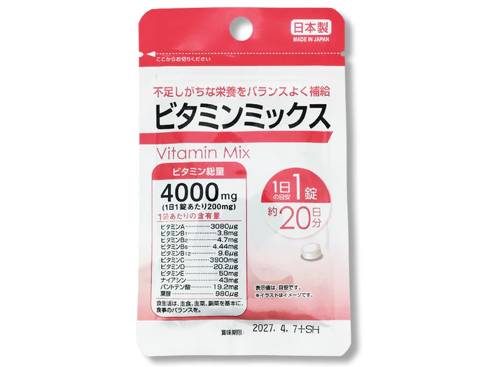 A balanced vitamin mix supplement designed to help support overall daily nutrition. Each pack contains 20 tablets with a total content of approximately 4000 mg per bag (about 200 mg per serving) and is intended to provide a balanced intake of essential vitamins and nutrients. Perfect for those looking to fill nutritional gaps in their diet and maintain general wellness. Made in Shizuoka, Japan.